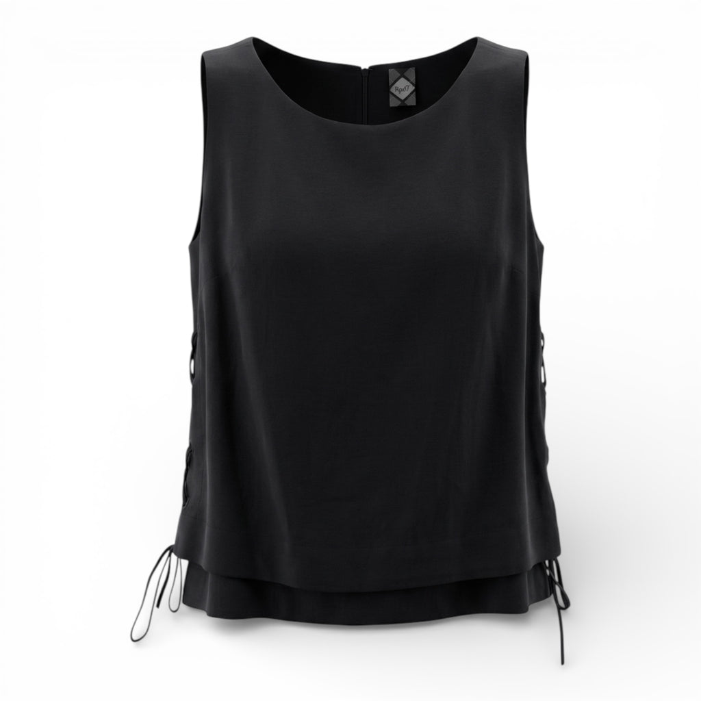 Black blouse made of linen, featuring side drawstring details. A Brazilian brand piece that offers a soft touch and excellent fit.