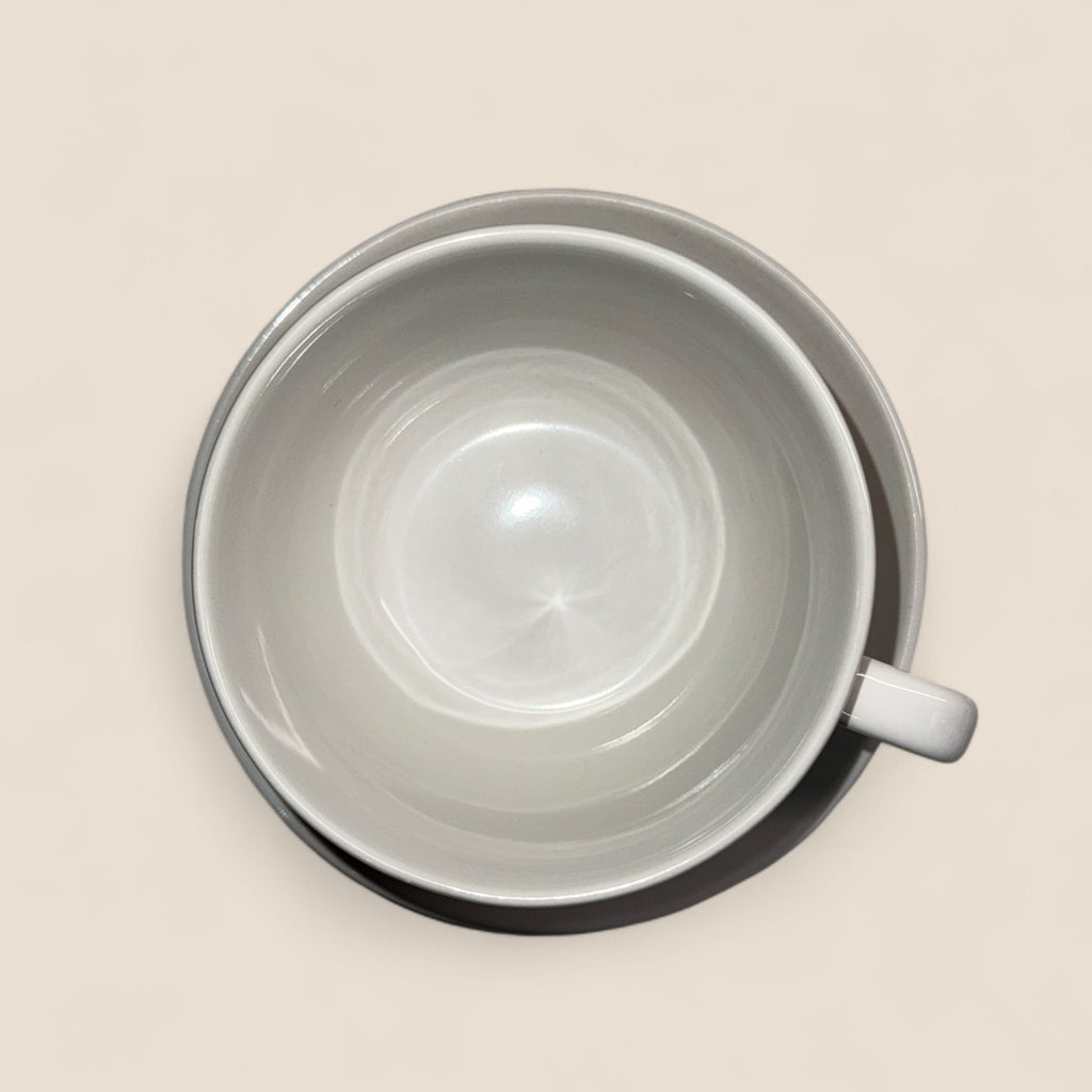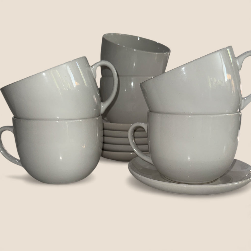 Classic and elegant set of 6 jumbo cups with matching saucers, made of high-quality white porcelain. All pieces are dishwasher and microwave safe, ensuring practicality and durability. In excellent overall condition — only one cup shows a slight sign of use at the bottom. Perfect for serving generous coffees, cappuccinos, or teas with style.