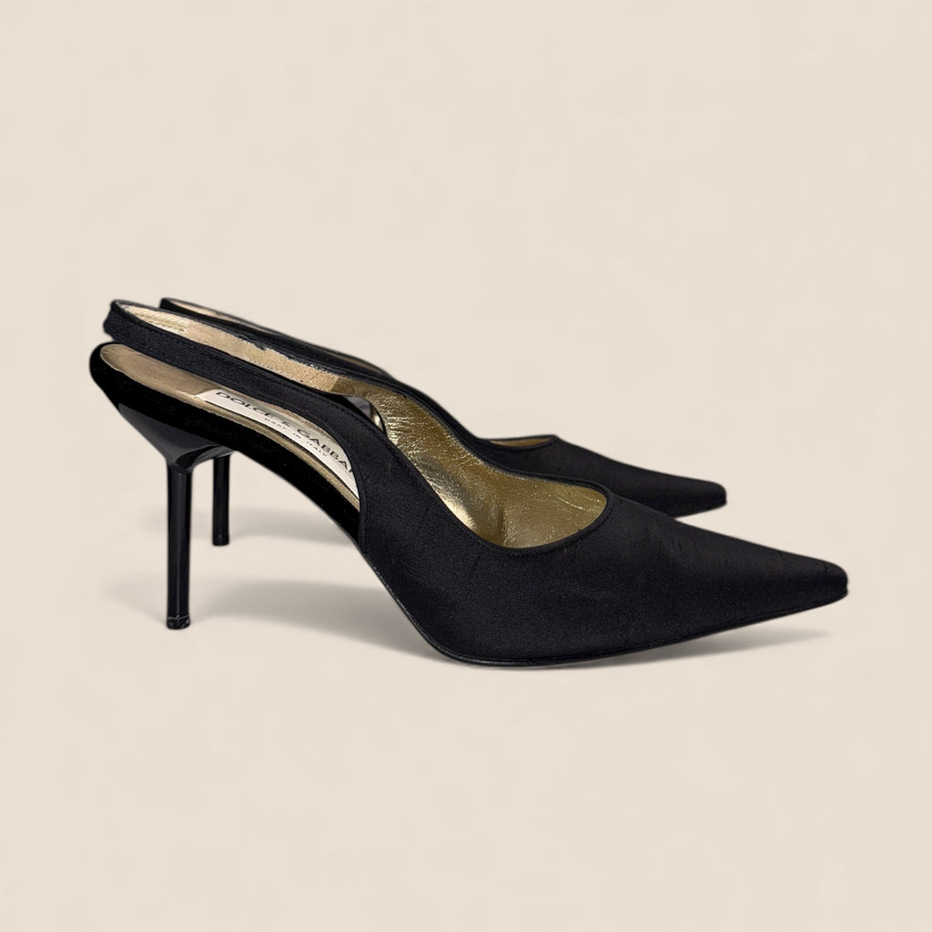 A refined and timeless pair of Dolce & Gabbana evening heels, crafted in luxurious black silk satin and designed with a sleek, feminine silhouette. The fine stiletto heel and pointed toe create an elegant, elongated look — perfect for special occasions, formal events, or elevating an evening ensemble.
