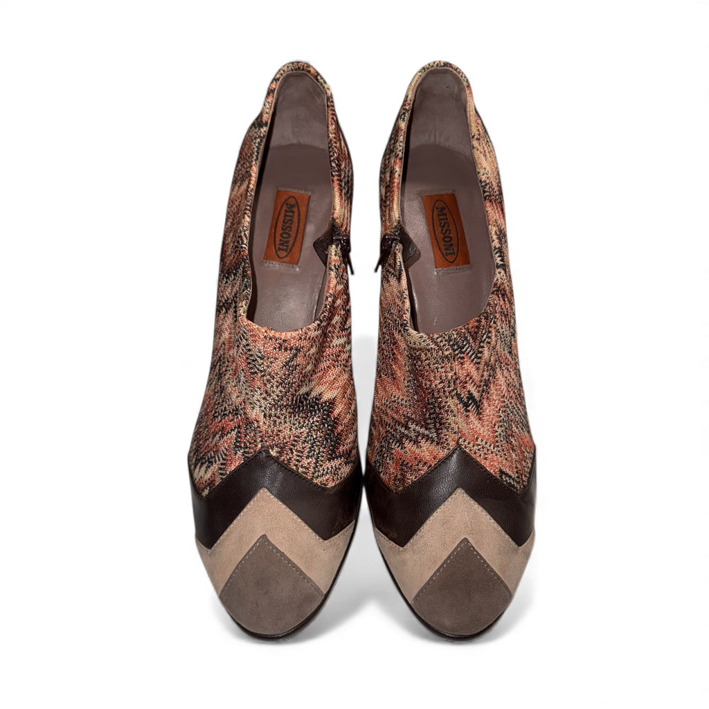 Missoni Ankle Boots | Brown Leather with Signature Zigzag Knit (Vintage, Like New)