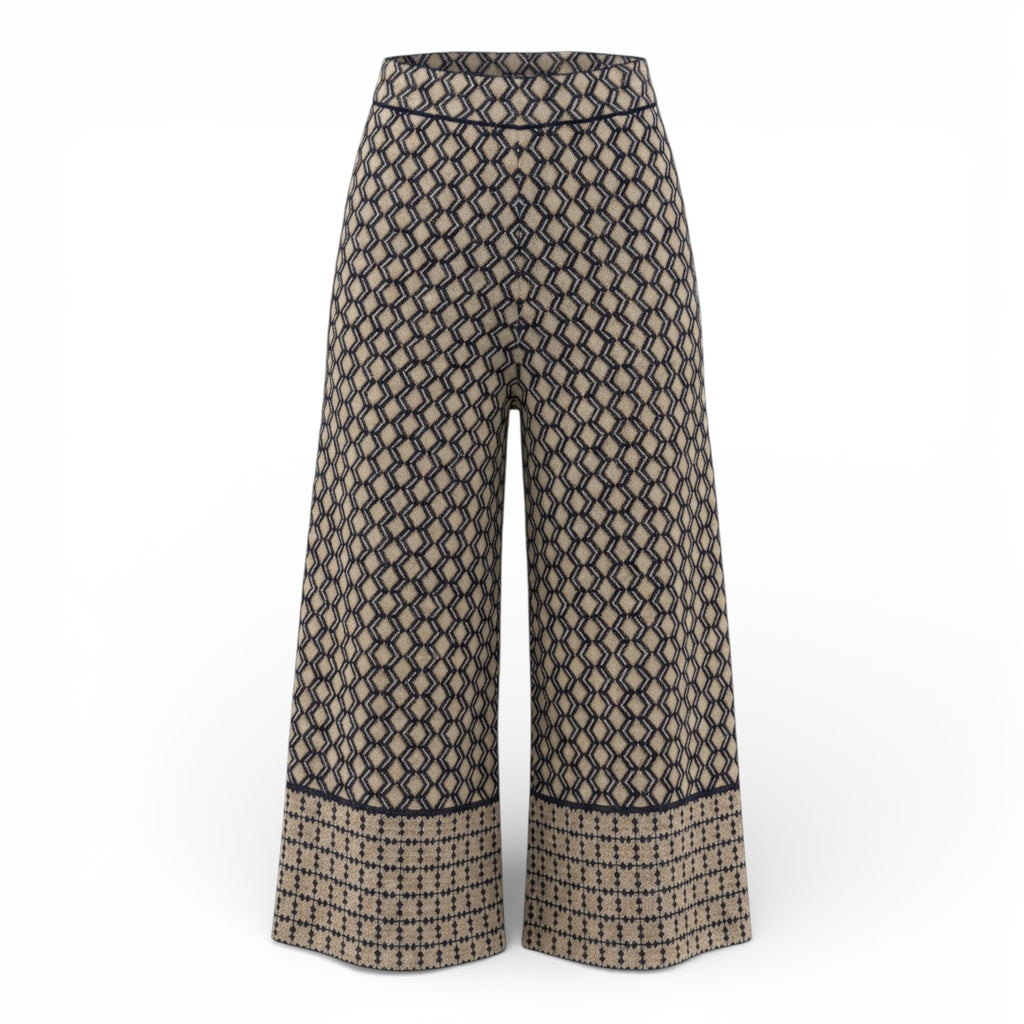 Zara wide-leg pants crafted in textured knit with subtle gold lurex threads woven throughout, creating a refined shimmer effect. The geometric pattern combined with the fluid silhouette brings a contemporary yet sophisticated feel.