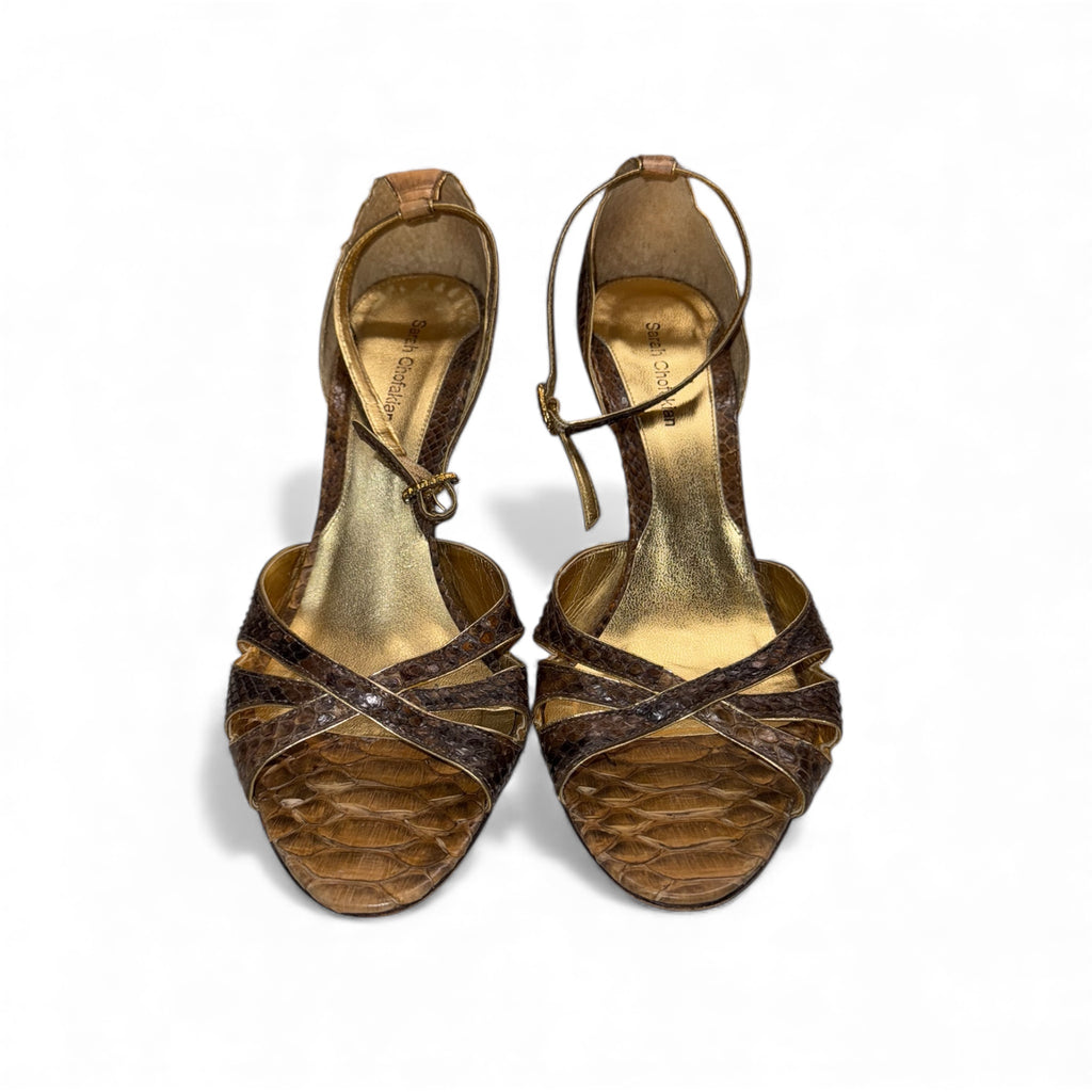 Sarah Chofakian Leather Sandals | Brown Snake-Effect with Gold Details, Stiletto Heel