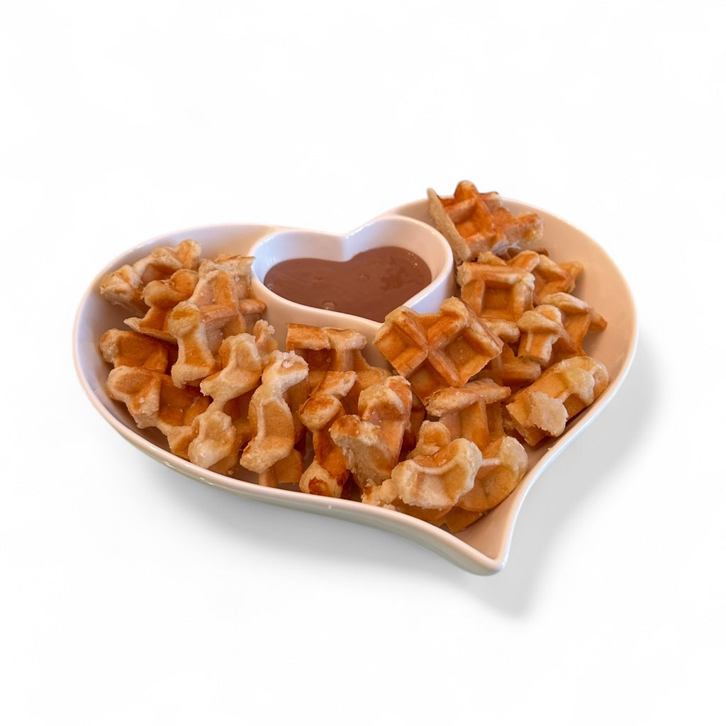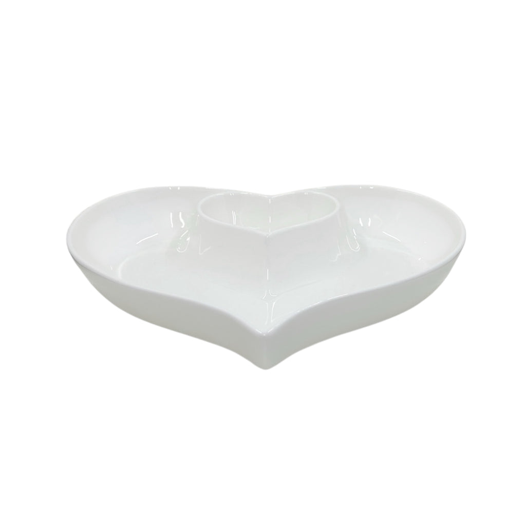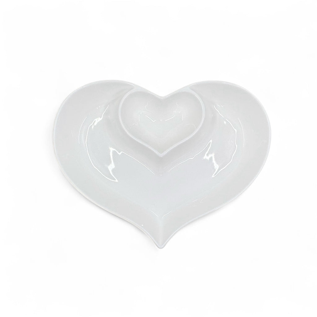 Delicado prato em cerâmica branca, em formato de coração, com dois compartimentos — ideal para servir alimentos secos e líquidos simultaneamente, como molhos, geleias, castanhas, frutas ou petiscos. Peça funcional e charmosa, perfeita para compor mesas afetivas, cafés ou brunchs especiais.